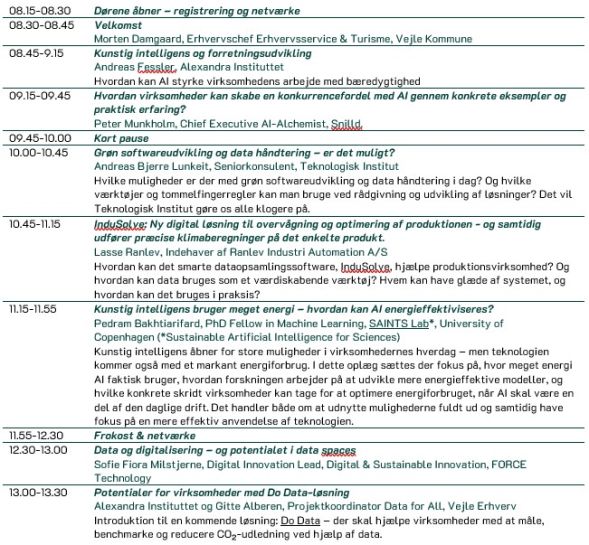 Eventet er relevant for alle virksomheder, der enten er i gang med eller ønsker at påbegynde den grønne omstilling ved hjælp af kunstig intelligens, datadrevet løsninger og andre digitale teknologier. Programmet byder på oplæg relevant for både produktionsvirksomheder, service og rådgivningsbranchen, samt softwareudviklere.