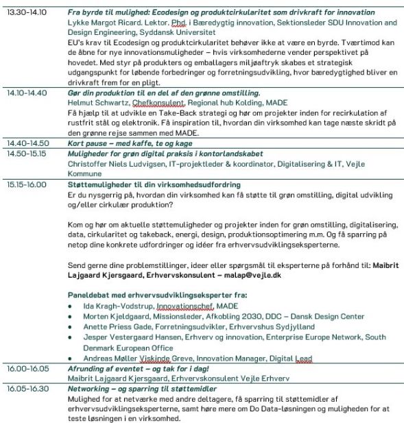 · Desuden kan du få feedback på din virksomheds udfordringer og projektideer, og vejledning til hvilke støttemidler, der kan understøtte din virksomheds grønne omstilling.